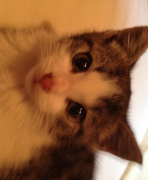 Liten grå/hvit kattunge funnet utsultet lørdags morgen. Tror der er en hankatt. Kjennetegnene: mørk grå hale med liten hvit tipp. Liten mørk flekk på den rosa nesen.