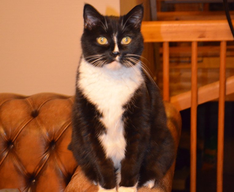 Han er slankere enn på bildet nå. Han er sort og hvit. hvitt bles i og haka. hvitt delvis som et bånd/ som en y på hals nedover på magen. hvite poter foran og hvit på bakben der opp mot kneet.