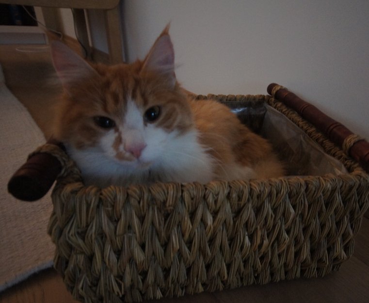 Rød og hvit pels, med litt ujevnt mønster over snuten. Chippet og tatovert med "ID" i det ene øret.