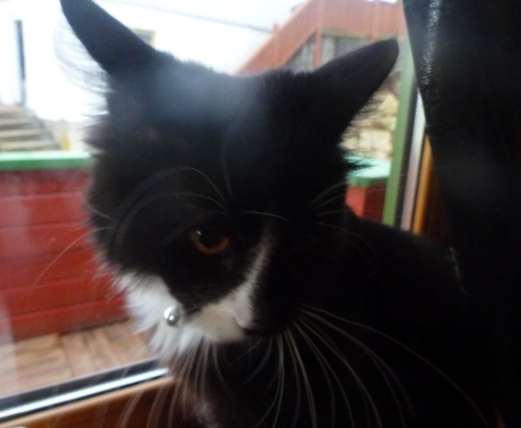 Svart katt med hvite flekker. Hvit på potene fremme og på den ene bakfoten, noe hvit på brystet og "halve" snuten (se bilde).
