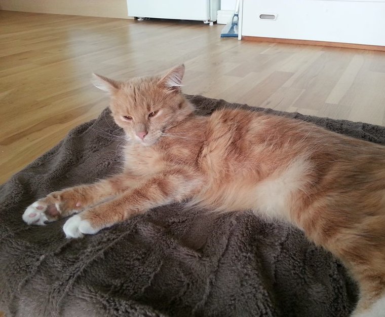 Denne katten kom til oss fredag 02.07.13 på formiddagen, skadet. Vi har vært i kontakt med dyrlege, den er hardt forslått i bekkenområdet, men virker ikke veldig smertepreget. Får smertestillende. Hun har på seg ett halsbånd som er gult, rosa og grønt. Hun har også en ekstra klo ut av ene poteputen på bakbenet! Veldig kosesyk og pratekatt.