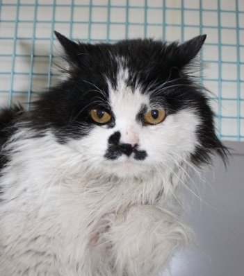 Svart og hvit med svart bart. Snill og trivelig kattemons. Veldig flokete i pelsen og skitten.