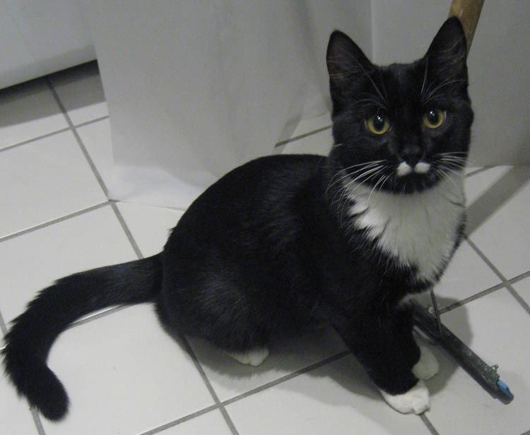 Liten hunnkatt, svart med hvite poter, hvit foran på brystet og på magen og hvite flekker under snuten. Lang og smal kropp. Er ikke merket og er ganske redd.