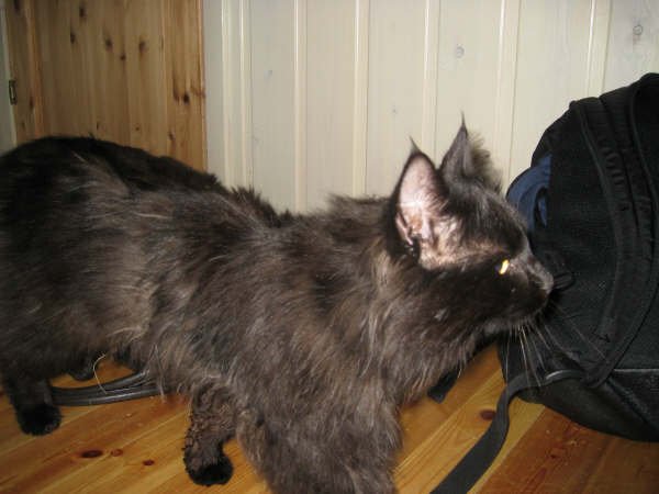 Svart, langhåret katt med litt lysere mage og bryst. Mye ørehår. Hvite hår innimellom over hele kroppen. Markert ansikt med litt spiss snute. Stor katt, nå 4-5 kg men likevel litt tynn.