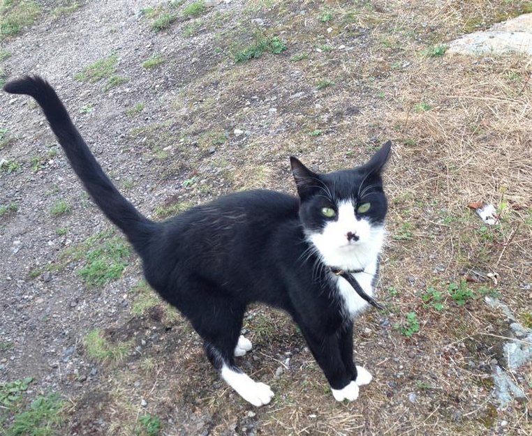 Katten var merket og kastrert, men vandrer mye og kommer helt utsultet hjem igjen. Jeg ga eier tips om å ha tlf nr på halsbåndet med en beskjed.