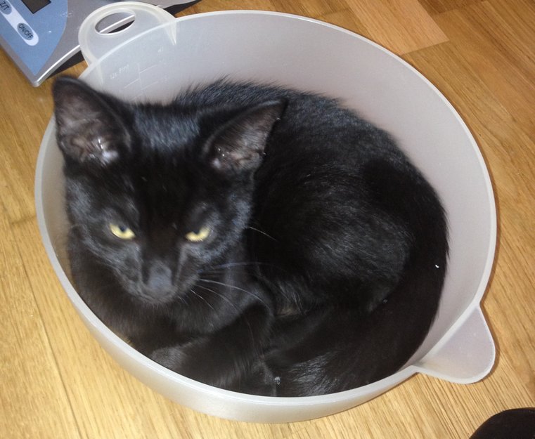 Helt svart, lang og tynn, han har en liten knekk helt på tuppen av halen