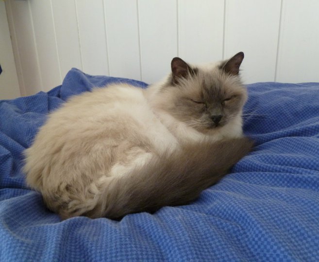 Blåmasket Hellig Birma. Hvite poter med mørkere partier oppover beina og hvit under. Beige/brunbeige langhåret pels. Mørk i ansiktet, ørene, nesen og halen. Blå øyne.