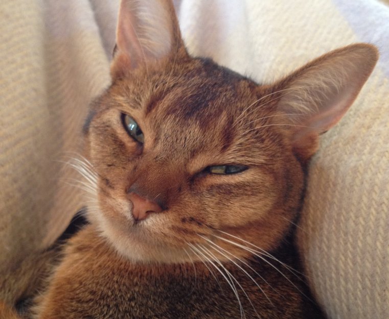Liten kastrert hannkatt. Brun med litt hvite og svarte tegninger.