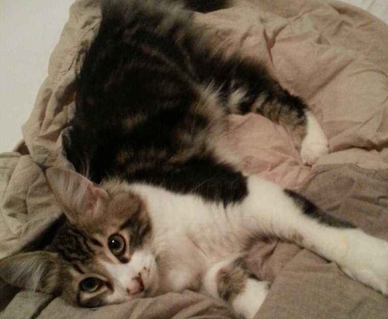 Fem måneder gammel, ganske stor for alderen men likevel liten sammenlignet med andre katter man pleier å se ute. Spesielt store ører.