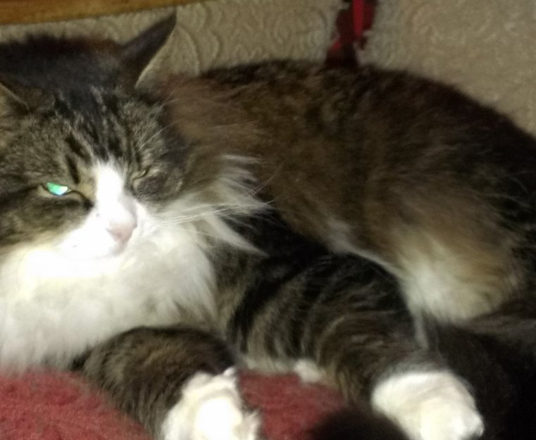 Er hvit rundt snuten og hvit trekant på brystet, hvite poter. Kan være kjælen, men også sky. Har mye skogskatt i seg og er glad i å klatre i trær.