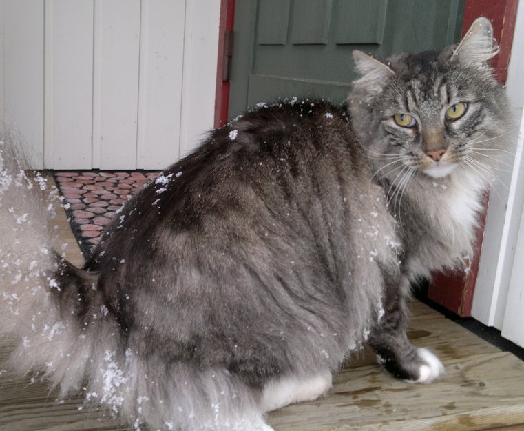 Etter 4 uker satt Tangluss å ventet på trappen når mormor og morfar kom hjem fra jobb :) I god behold, sett bort fra mye klumper i pelsen som måtte barberes bort...