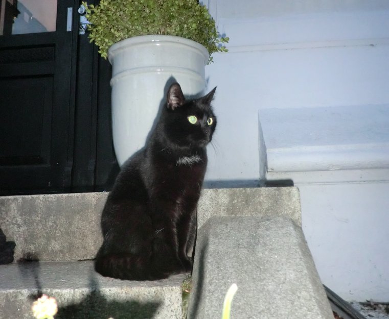 Gule øyne, helt svart, korthåret pels med unntak av litt hvite hår under haken. Svarte poter. Sky mot fremmede folk. Utvisket tatovering i øret som hun fikk i forbindelse med chipmerking, tror det står tallet "10" (venstre øre).