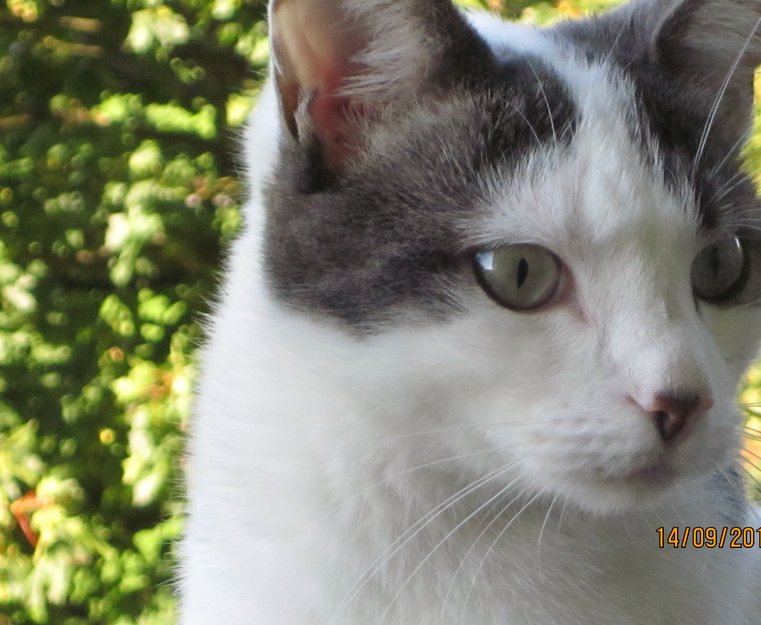 Huskatt, slank, ca 4 år, rødt halsbånd med "diamanter", hvite labber, mage og rumpe-parti, ellers hvite og sorte/gråstripede partier, nesetippen er både sort og hvit. Haletippen også hvit. Nyklipte klør. Kjælen mot både kjente og ukjente.