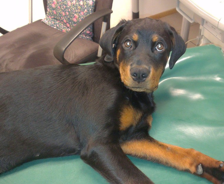 Rotweiler tispe på nesten 5 mnd. Har ikke halsbånd på. Veldig nysgjerrig og glad i folk og dyr.