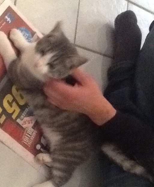 Liten kattejente funnet løpende i trafikken, måtte stoppe flere biler for at de ikke skulle kjøre på den. Tror det er en hunkatt for de mente det på smådyrklinikken når vi så etter chip. Virker litt skjev i hodet