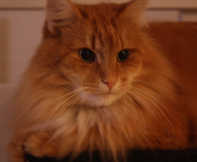 Han har lang oransje pels, litt hvit under haken. Har karakteristisk høy mjauelyd. Liker å følge etter folk som går på tur så vi håper han bare har gått seg bort. Er øremerket med nr: 80854