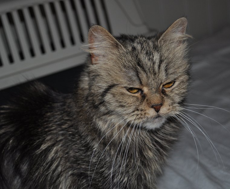 Liten hunnkatt I dårlig forfatning fanget inn kvelden den 13.08.13. Bærer preg av å ha vært på avveie en stund, men på bedringsvei nå. Ikke id merket, men hadde halsbånd. Kan se ut som en perser blanding.