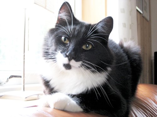 Langhåret, svart/hvit, svært myk pels. Han er 4 år. Morsomt uttrykk i ansiktet med hvite barter og hvite svært synlig værhår. Ganske stor av størrelse - men ikke tjukk. Han mjauer veldig rart. Er veldig kjælen når han blir trygg.
