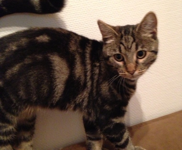 Han er såkalt "makrellstripet" med M i panna.