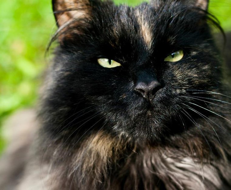 Spraglete/skilpaddefarget pels. Litt ujevnt klipp ettersom hun fikk en liten klipp i sommer. Kan være veldig kosete ovenfor mennesker hun stoler på, men er ofte skvetten.