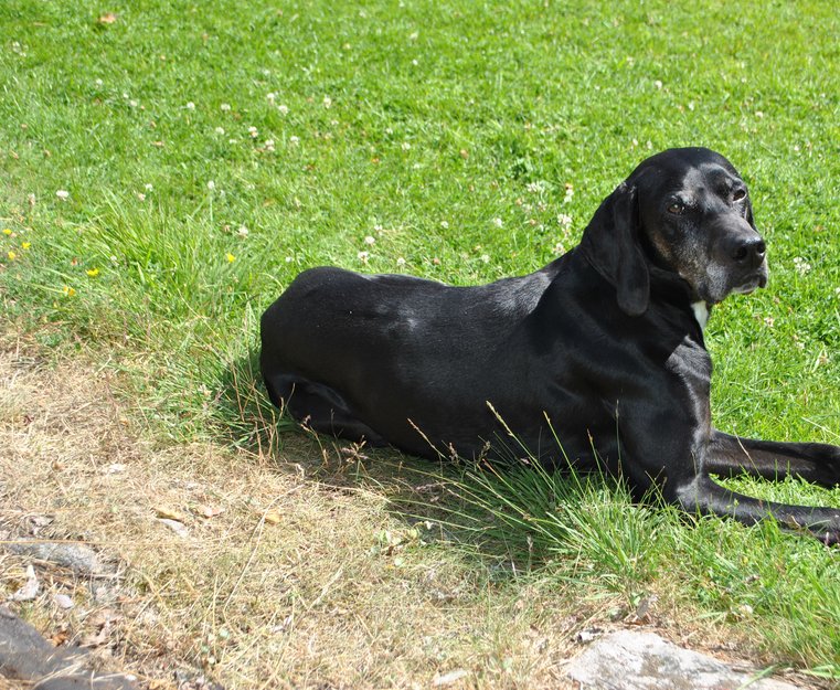 En slank og godt trent voksen hannhund på 10 år. Litt hvitt på brystet og på potene, og litt hvit rundt snuten.