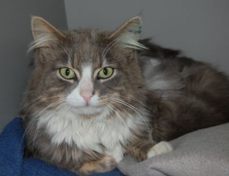 Grå, hvit og brunora hannkatt ble funnet i Malvik