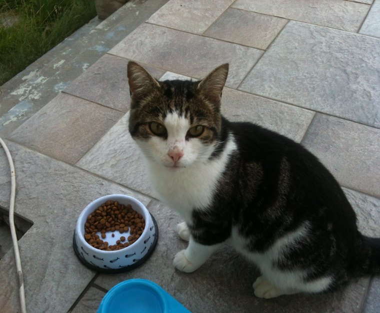 Den dukket opp i nabolaget i begynnelsen av juli. Den var tynn og veldig sulten. Har siden holdt til hos oss.