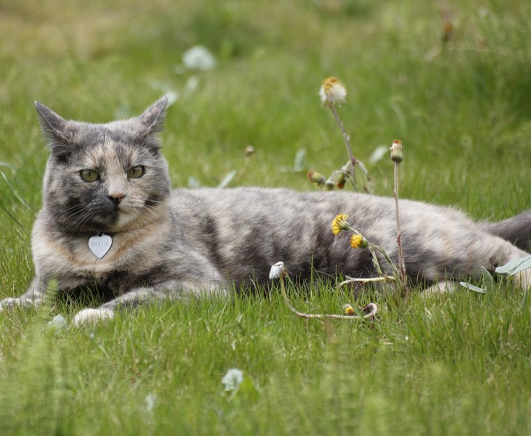 Grå og beige skilpaddemønstret. Ansiktet kan se todelt ut med beige på ene siden. Tre beige poter og en spraglete. Har halsbånd med navn og mobilnr.