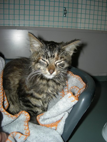 Langhåret tigerstripet kattunge, mager og utslitt.