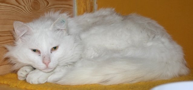 Hvit semilanghåret hannkatt.