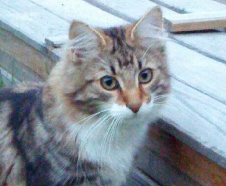 Katten strøk rundt på tomten vår og har ikke gått mer enn 25 meter fra terassen, hvor hun nok har bestemt seg for å bli. Hun virker sulten og er veldig kjælen og kosete. Mjauer hele tiden og virker ganske fortvilet.