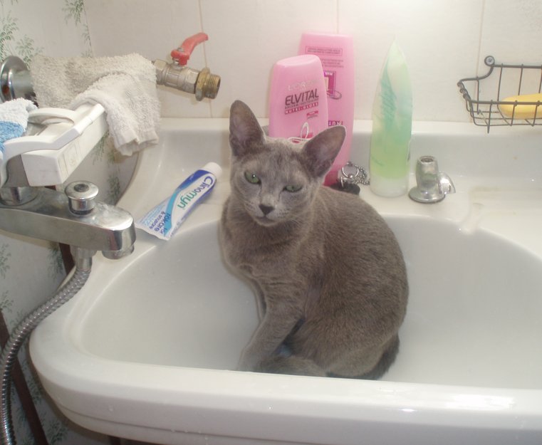 Grå, liten og slank katt med store ører i forhold til ansiktet