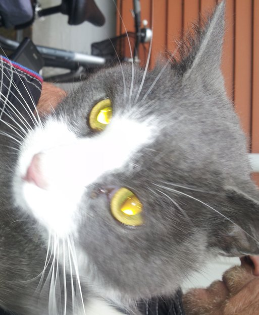 Grå og hvit, ukastrert, kanskje 1år.