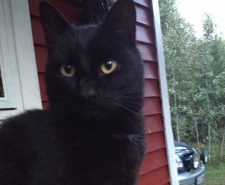 helt sort med noen få hvite hår på brystet. oransje øyne. Veldig kosete, tillitsfull og nysjerrig.