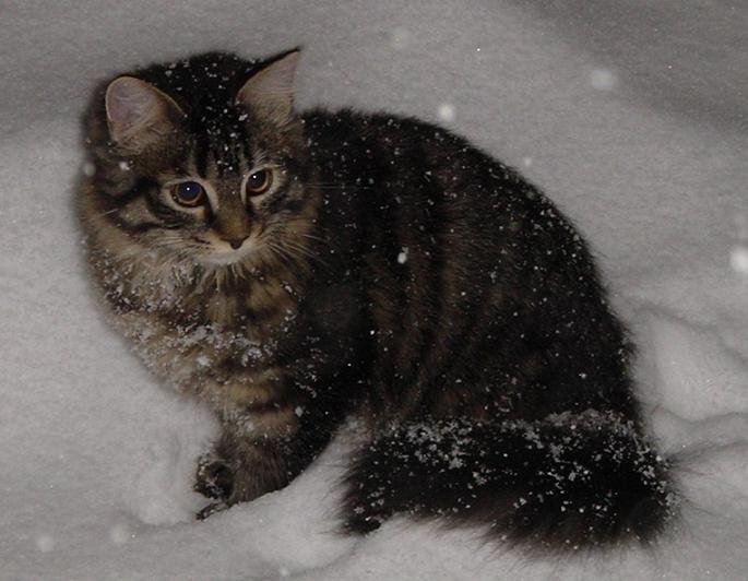 Ola har en skogskatt til far og en huskatt til mor, så han er en huskatt med skogskatt-trekk. Langhåret og spraglete. Mørk grå ispedd noe beige/hvitt.