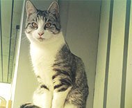 Søt jakt-pus som er grå og sort spraglete med hvitt felt på ryggen.