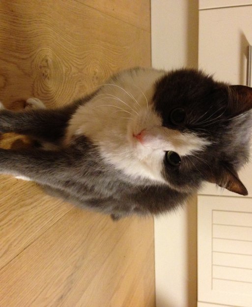 Grå, med hvite tegninger i ansiktet, brystet og potene. Er litt rufsete, og ellers veldig tynn.