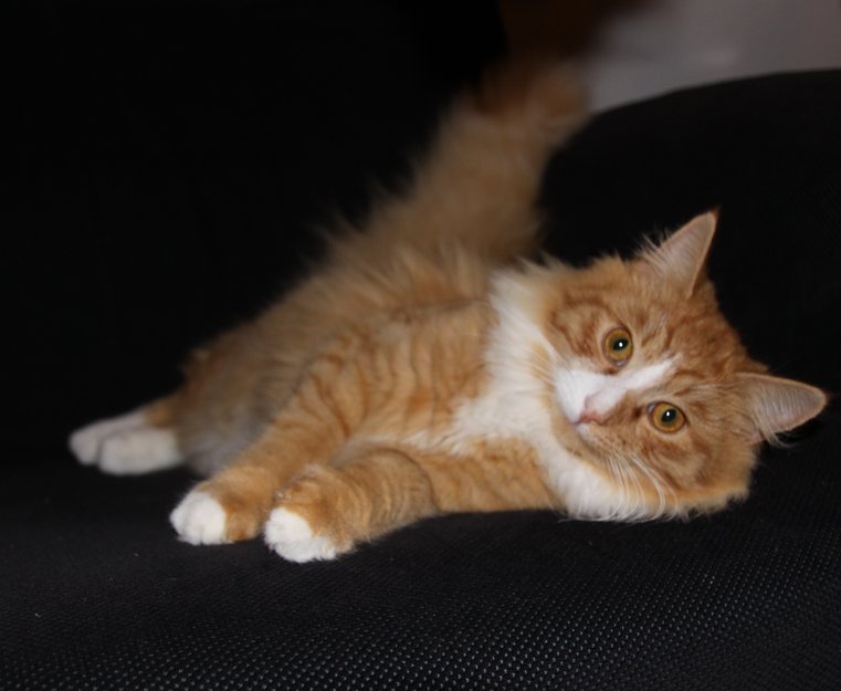 Hvit på snuten, brystet, potene, utrolig fin hale. Resten av katten er lys orange med hvitt