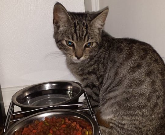 Den virker til å være en blandingskatt. Kanskje blanding av typen Bengal pga den har "leopardprikker", men er ikke sikker. Helt svarte poter og mørk nese. Olivengrønne øyne, Litt store ører. Veldig kosete,vant og leken med folk og barn. Spiser godt og drikker mye vann. Tror kattens alder er rundt 5 måneder.
