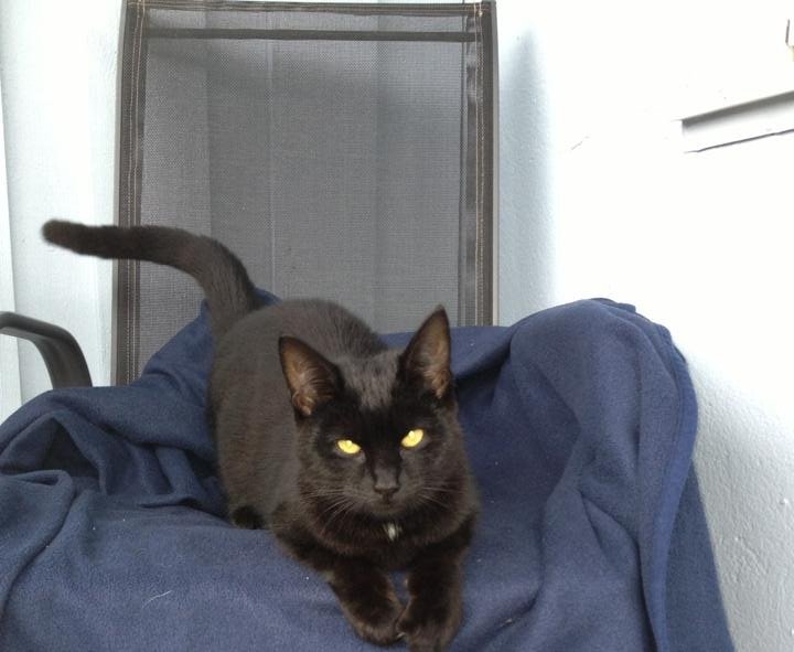 Svart med litt hvitt på bryst og mage. Rosa/lilla Whiskas halsbånd