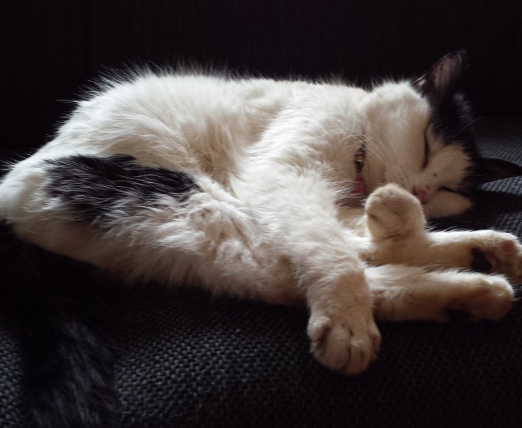 Øremerket og liten hunnkatt. Hvit med sorte flekker, sort hale og hette. Ekstremt kosete og glad i mennesker.