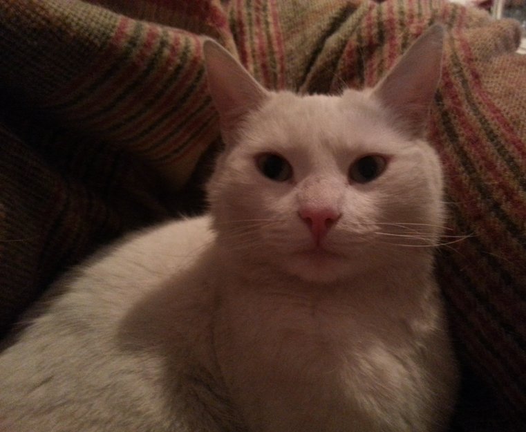 Hvit, kastrert hannkatt.