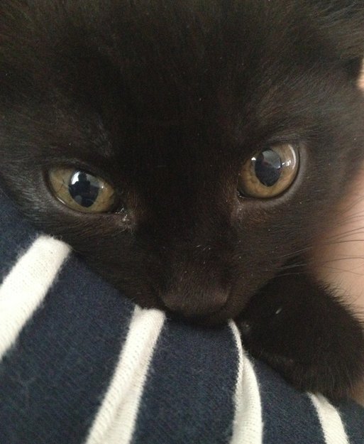 Vår svarte hunnkatt er borte. Hun har små tuster på ørene, liten hvit flekk øverst på brystet. Gulbrune øyne. Slank og fin og blank i pelsen, kontaktsøkende og kjælen.