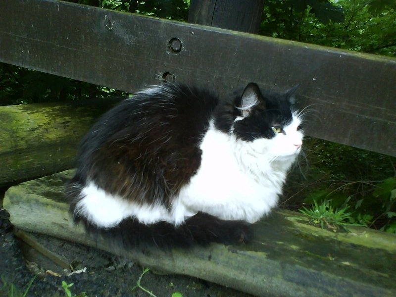 Kom til oss ca 15. mai, tynn og mager, har vært her og i området siden, veldig kosete!Men ganske skvetten og nærvøs. Vi skal flytte snart og katta kan ikke bli med, så håper noe kan gi den et nytt hjem! :)