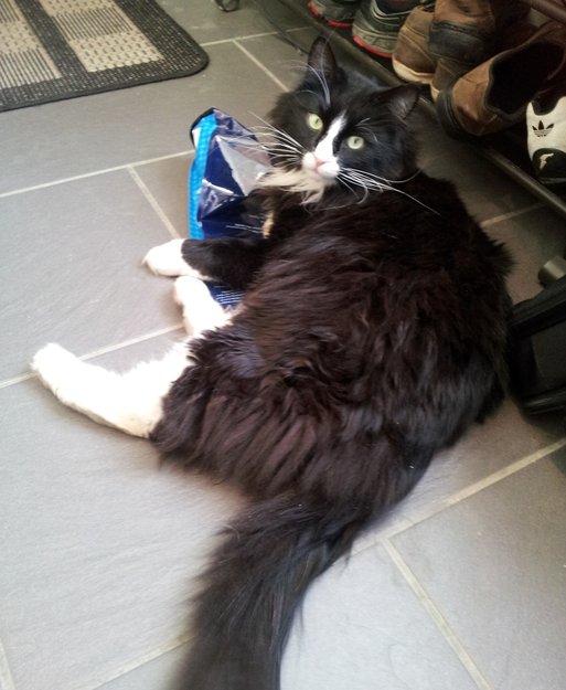 - Katt, Stor langhåret svart og hvit hannkatt, ligner Miss i Postman pat