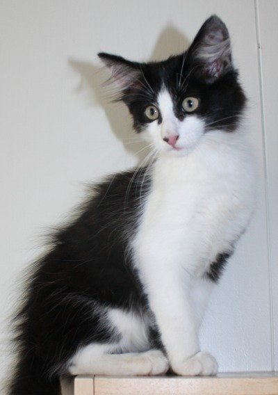 Svart og hvit langhåret hankattunge. Snill, kontaktsøkende tynn og meget sulten.