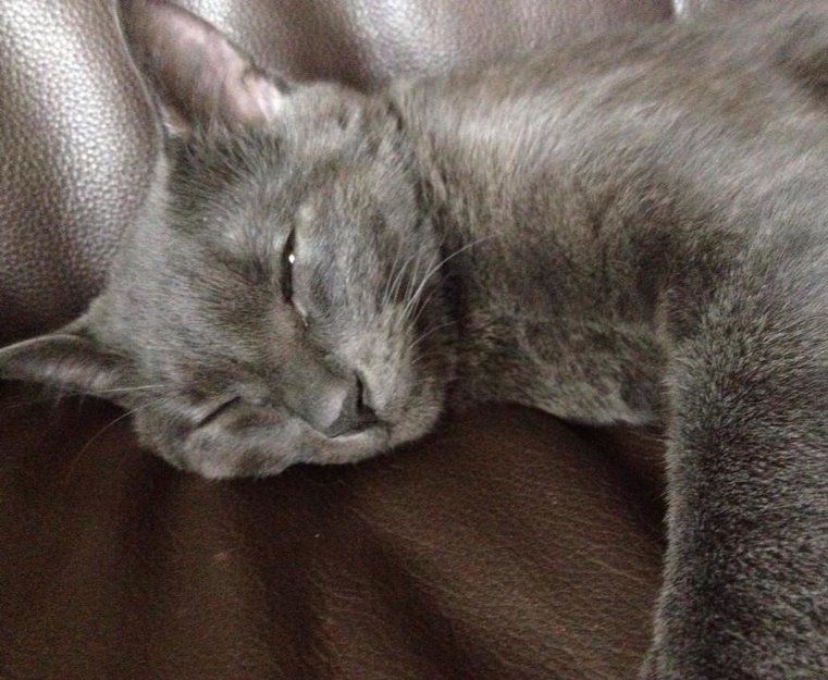 5-6 hvite hår i brystet. Litt redd av seg. Kastrert hann. 1 år gml