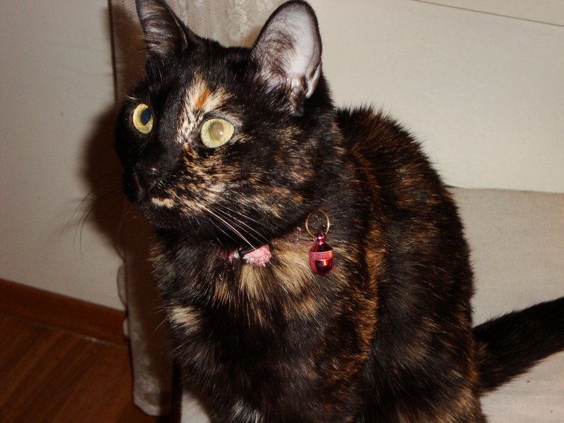 Mira mjauer og snakker mye. Hun er en flekkete sosial hunkatt som er ganske liten.