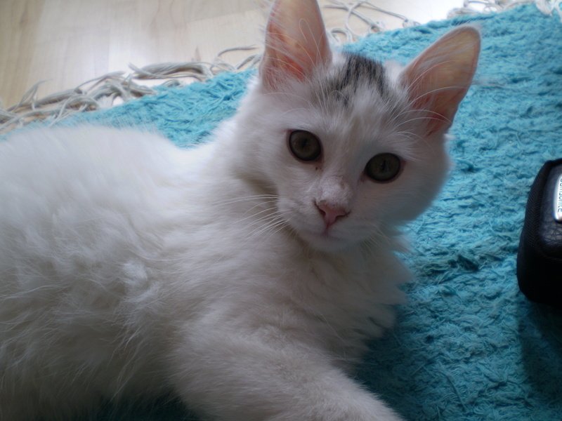 Mille er helt hvit, med en sort stripe på hodet. Hun har et blått halsbånd med bjelle på.