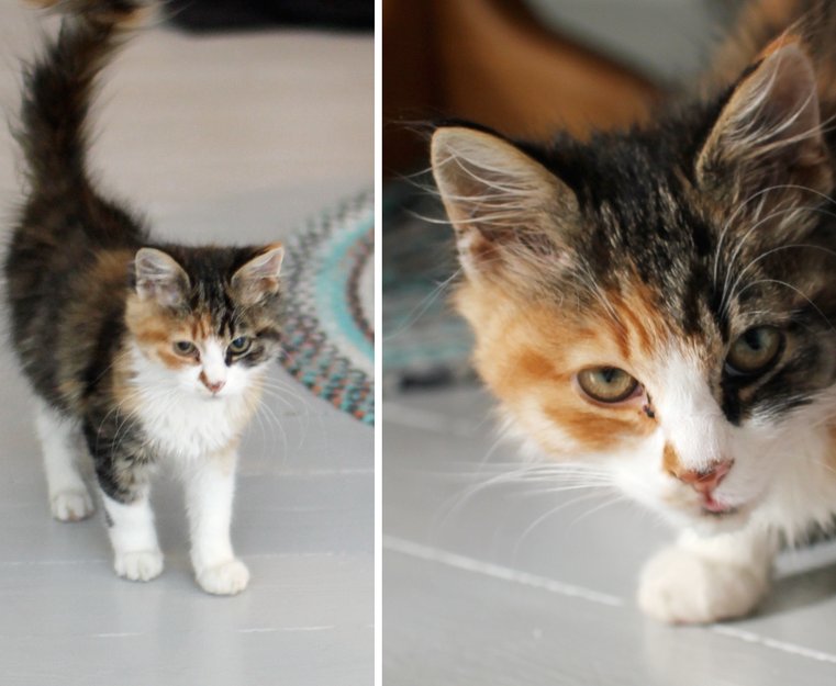 Hvite poter, brun flekk på snuten. Ganske liten kattunge, ikke veldig mange ukene...